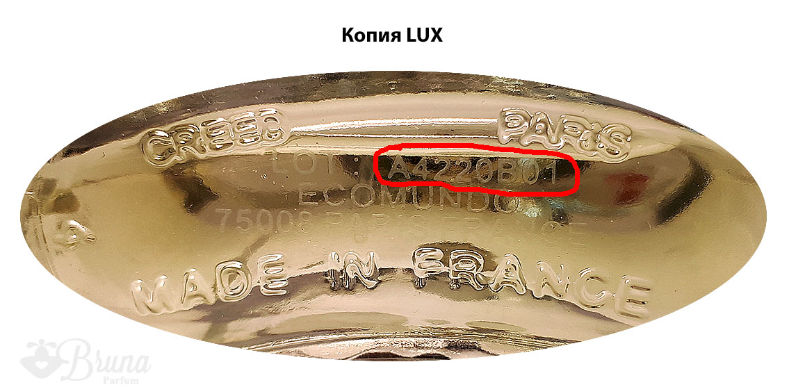 На дне флакончика наклеена этикетка, что в оригинале, что в лицензии и они практически одинаковы. Батч-код присутствует и там и там. Как и положено, он совпадает с батч-кодом нанесенным на дно коробочки. Батчкод в копии LUX нанесен вызывающим жирным шрифтом.